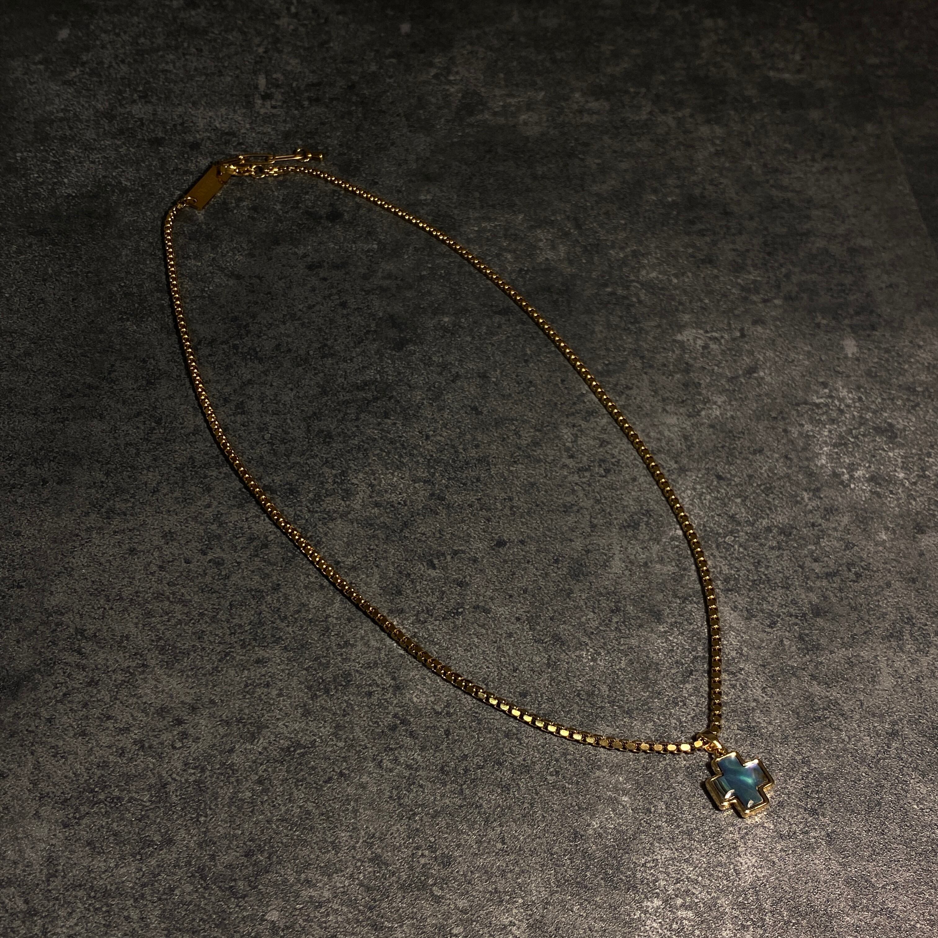 深いグリーンのアバロン×クロスがユニークで、首元のスタイルに一気にムードを足せるネックレス。