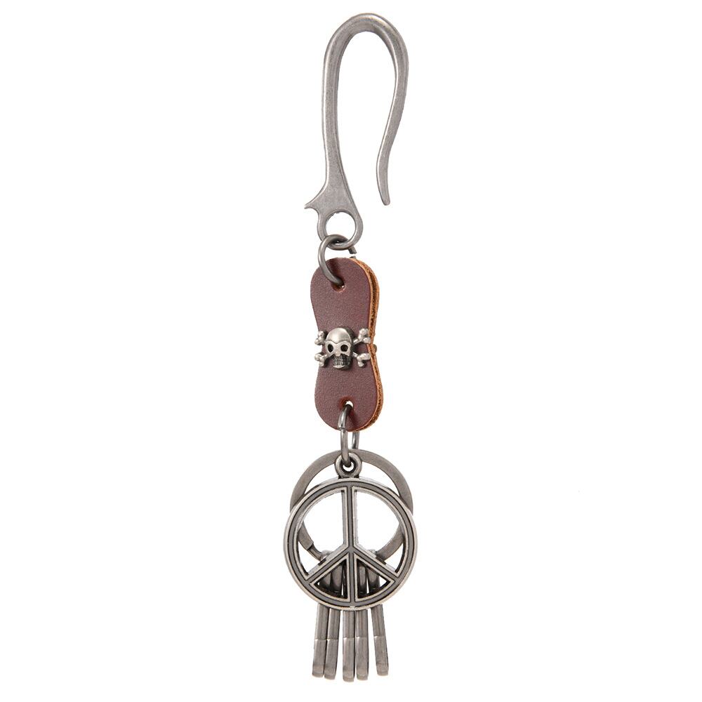 合成皮革パーツにスカルスタッズをあしらい、その下にはピースマークチャームとメタルパーツを組み合わせたパンクテイストのデザイン。