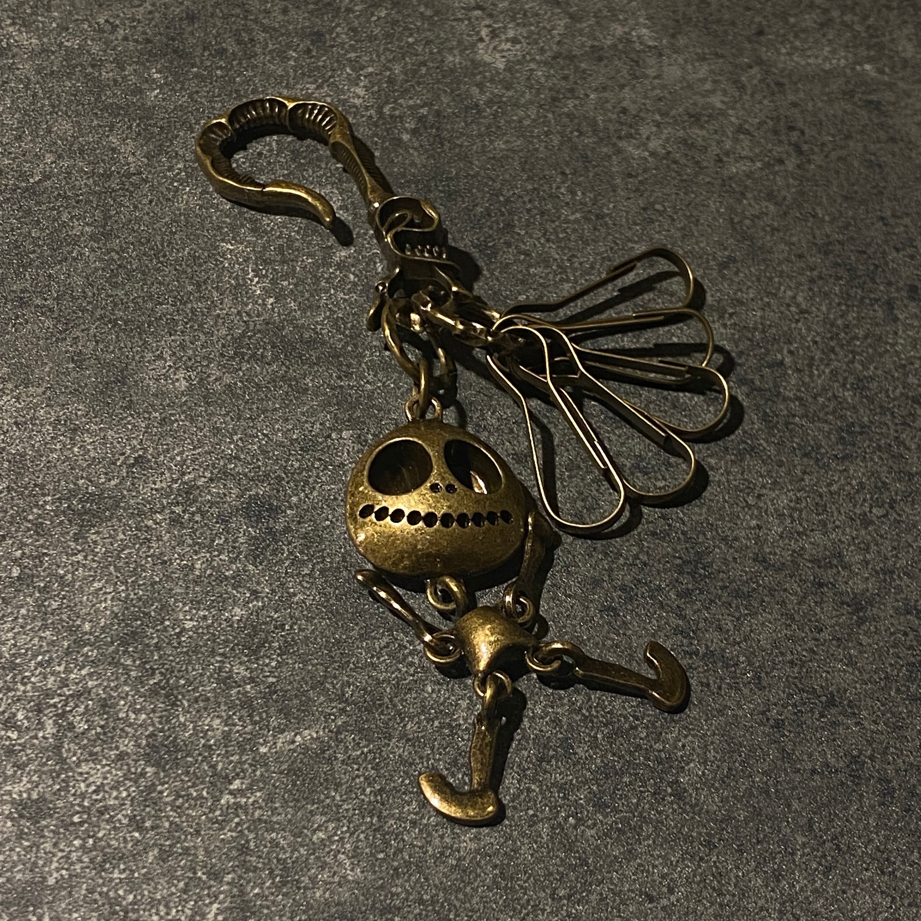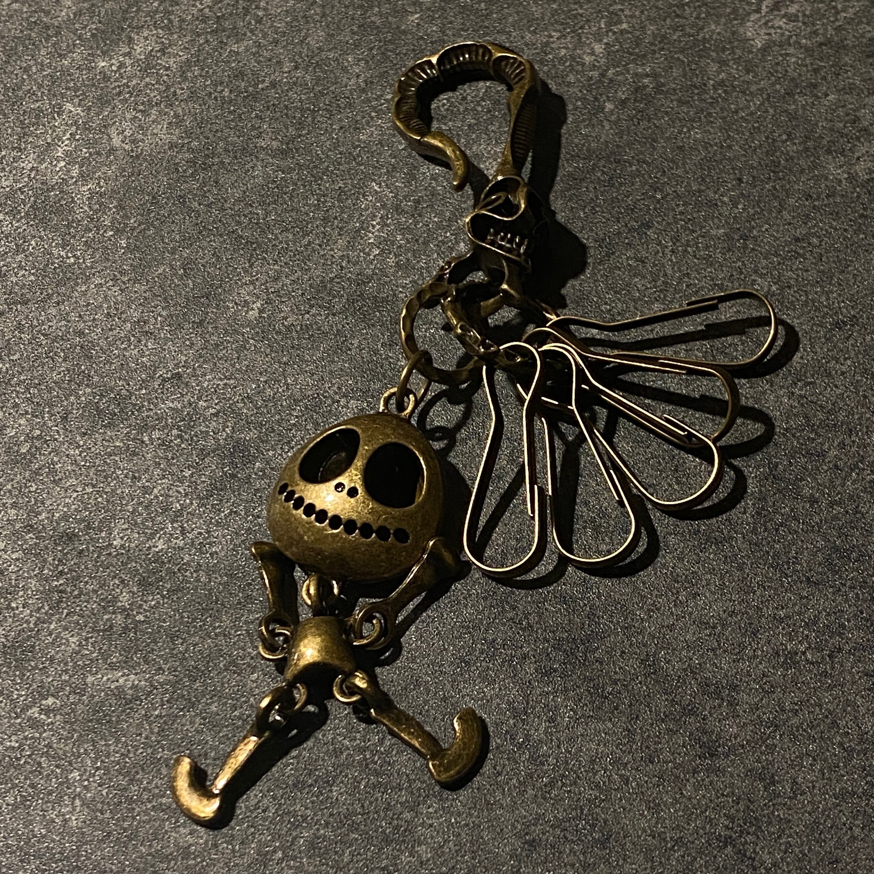 フック部分をベルトループやバッグに引っ掛けて使える、ビジネスにもカジュアルにも合わせやすいフックタイプのキーチェーンです。大きな目が印象的なスカルドールチャームに、複数のキークリップを組み合わせた個性派デザイン。アンティーク調のメタルカラーがアクセントになりつつ、派手すぎず大人っぽい雰囲気で持てるのもポイントです。全長約15cmとコンパクトなサイズ感で、家鍵・車のキー・ICカードケースなど、毎日持ち歩く小物をまとめて管理できます。